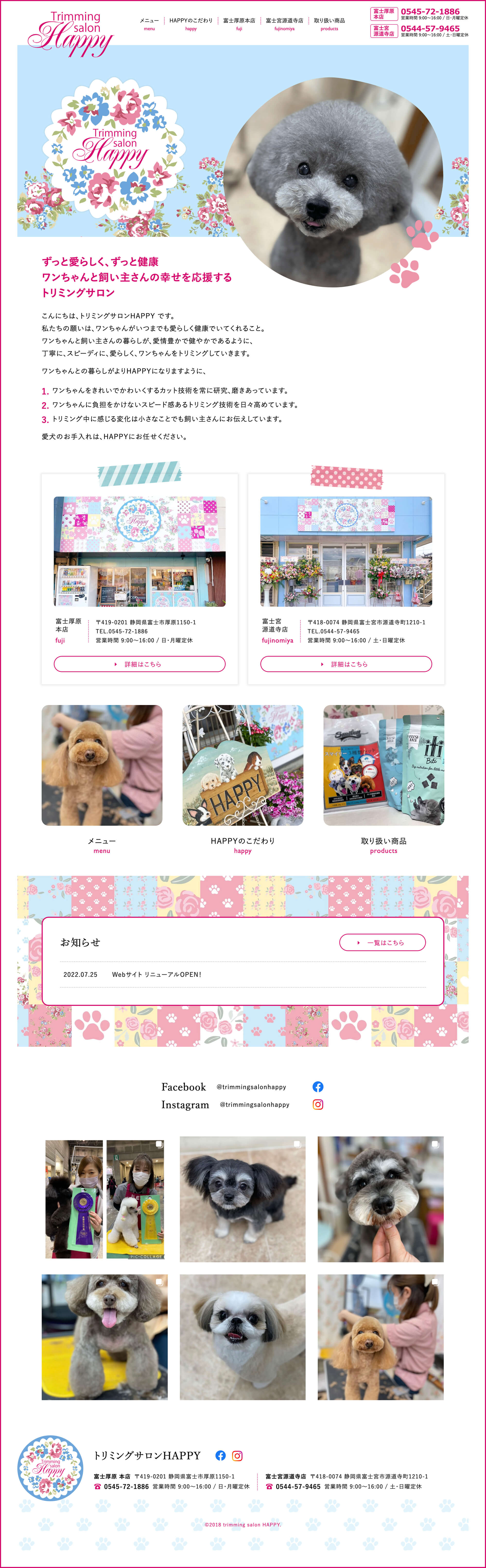 静岡県富士市、富士宮市に店舗を構えるワンちゃんのトリミングサロンHAPPY様のWebサイトを制作させていただきました。